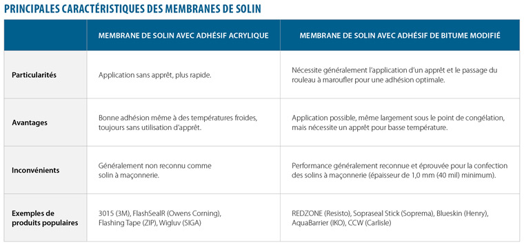 Les membranes autocollantes avec adhésifs à base acrylique qui sont disponibles sur le marché ont habituellement des propriétés pare-air et pare-vapeur en plus d’être résistantes à l’eau, mais elles ne sont généralement pas autorisées à être utilisées comme solin intramural pour la maçonnerie. En fait, la section 9.20 du Code traitant de la maçonnerie indique qu’un solin peut être constitué de polyéthylène à condition d’avoir une épaisseur minimale de 0,5 mm (20 mil), ce qui n’est généralement pas le cas de ces membranes.