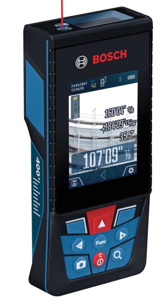 Le mesureur modèle nº GLM400C BLAZE de Bosch possède un téléobjectif qui permet de voir le point laser jusqu’à une distance de 400 pi. Il est également équipé d’un inclinomètre permettant d’effectuer des calculs à partir d’angles et de mesures. L’application « Bosch MeasureOn » peut aussi être utilisée pour consigner les dimensions mesurées. Photo : Bosch