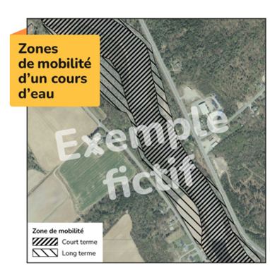 - Des zones de mobilité (ZM) des cours d’eau, soit l’espace dans lequel le lit d’un cours d’eau peut réaliser un déplacement.
