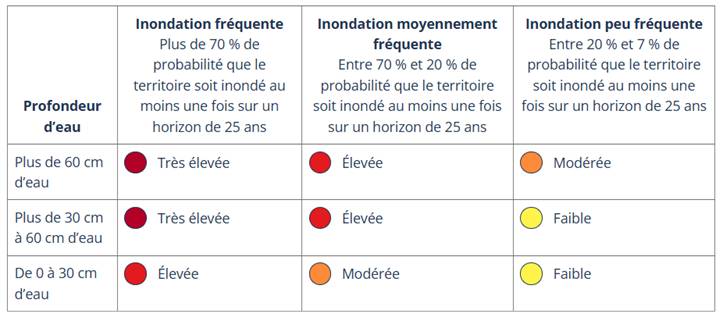 - Une matrice à quatre classes d’intensité quant aux risques d’inondation sur un territoire donné : très élevée (rouge foncé), élevée (rouge), modérée (orange) et faible (jaune)[2].